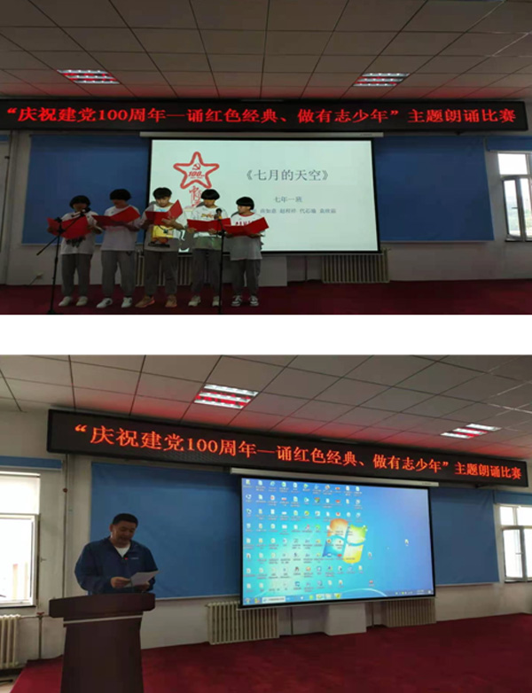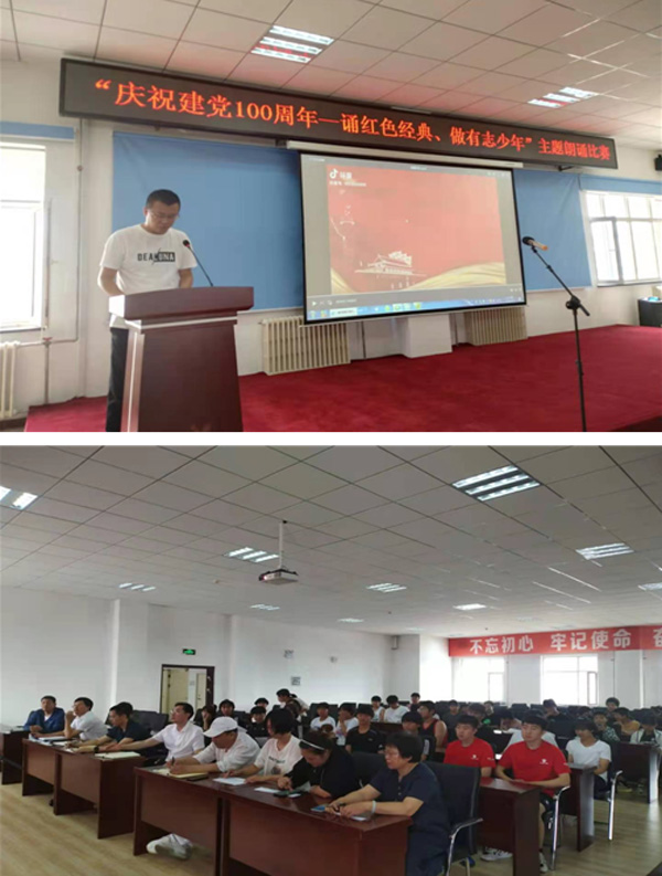 為迎接“建黨100周年”慶典,進一步深入貫徹未成年人德育教育工作要求,落實“童心向黨”教育精神,增強學(xué)生愛黨愛國情懷,營造濃郁的黨史學(xué)習(xí)氛圍,加強校園文化建設(shè),豐富學(xué)生課余生活,我校于6月25日上午舉辦了“慶祝建黨100周年——誦紅色經(jīng)典、做有志少年”主題朗誦比賽。 賽前,各位班主任精心挑選參賽作品,重點選拔參賽選手,設(shè)計背景畫面、選配背景音樂,帶領(lǐng)參賽同學(xué)反復(fù)排練。經(jīng)過2周的認真準(zhǔn)備,共計報送了12個參賽作品,經(jīng)校領(lǐng)導(dǎo)審查,最終確定保留10個質(zhì)量較高的作品參加比賽。 比賽過程中,各位參賽同學(xué)情緒飽滿、斗志高昂,通過他們聲情并茂、慷慨激昂的朗誦仿佛又將我們帶回到了那段硝煙彌漫、艱苦卓絕的崢嶸歲月,共同感受革命先烈矢志不渝、敢于犧牲、敢于勝利的偉大精神。 賽后,同學(xué)們紛紛表示:通過參與比賽,深刻認識到紅色政權(quán)來之不易、新中國來之不易,作為中國人,我們要為此自豪、為此驕傲,今后,要努力學(xué)習(xí)、刻苦訓(xùn)練,以優(yōu)異的成績向“建黨100周年”獻禮。 我校領(lǐng)導(dǎo)對此次朗誦比賽高度重視,全程參與了作品審查、賽中評分、賽后頒獎全部環(huán)節(jié),對參賽同學(xué)和班主任的努力工作和辛勤付出給予了充分肯定。